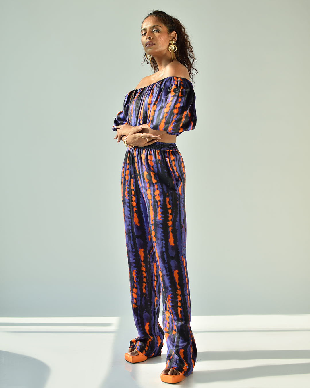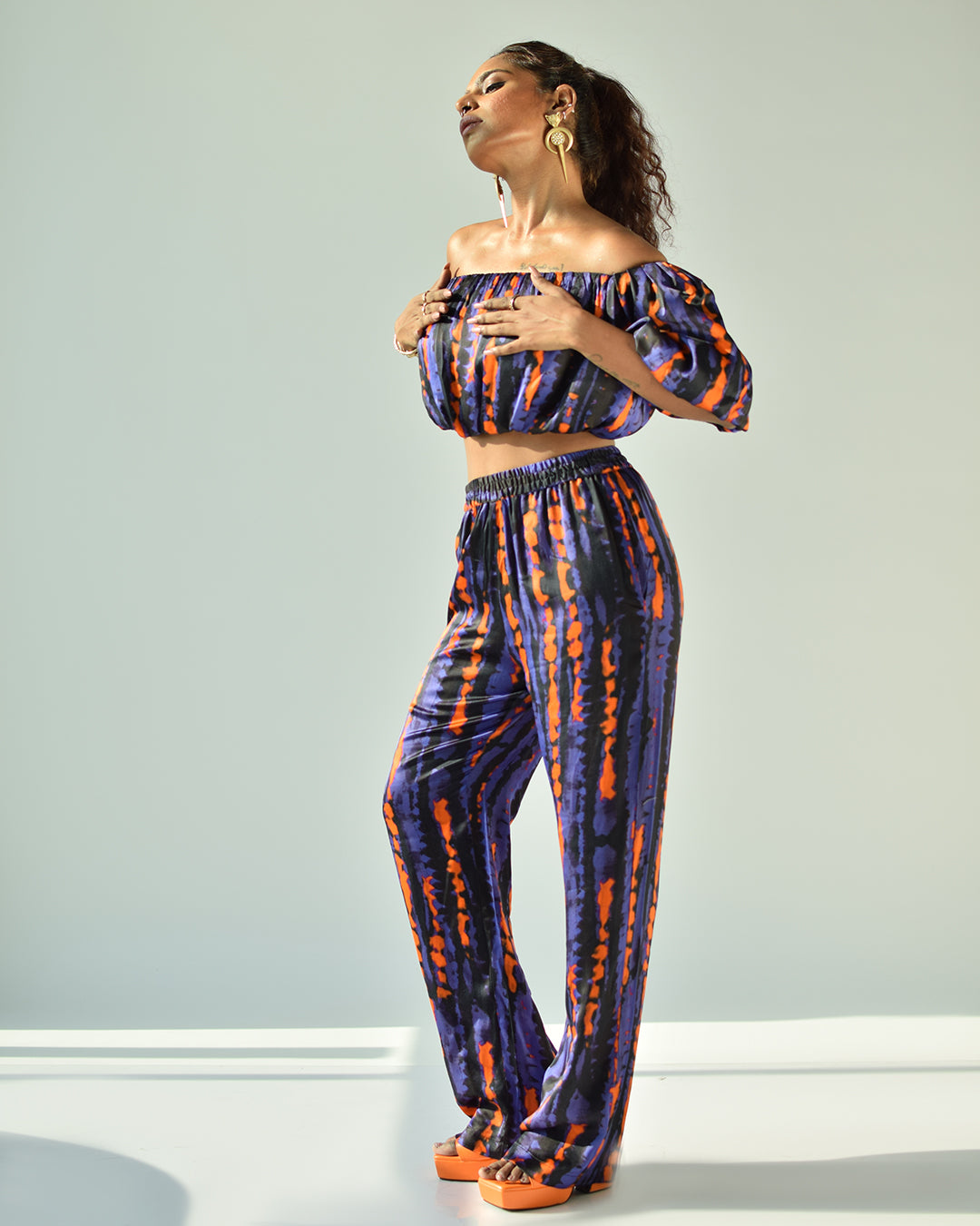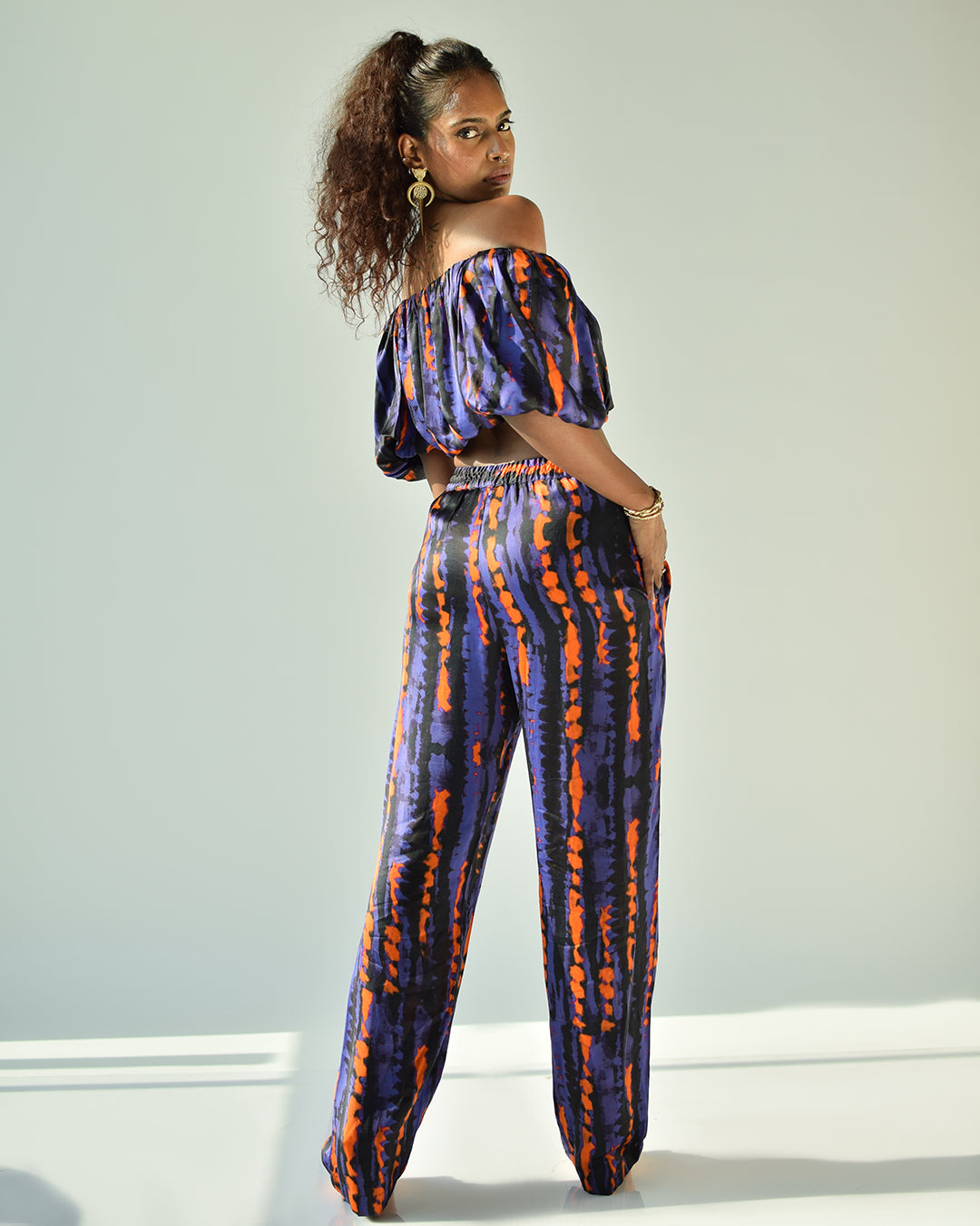 An abstract printed straight pant in satin should be your go-to outfit.