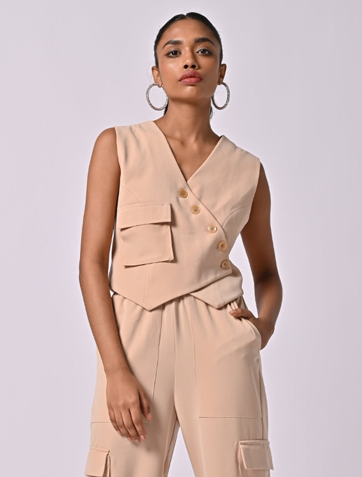 Featuring a soft, asymmetric front and multiple buttons, this utility waistcoat is crafted to elevate your style.