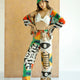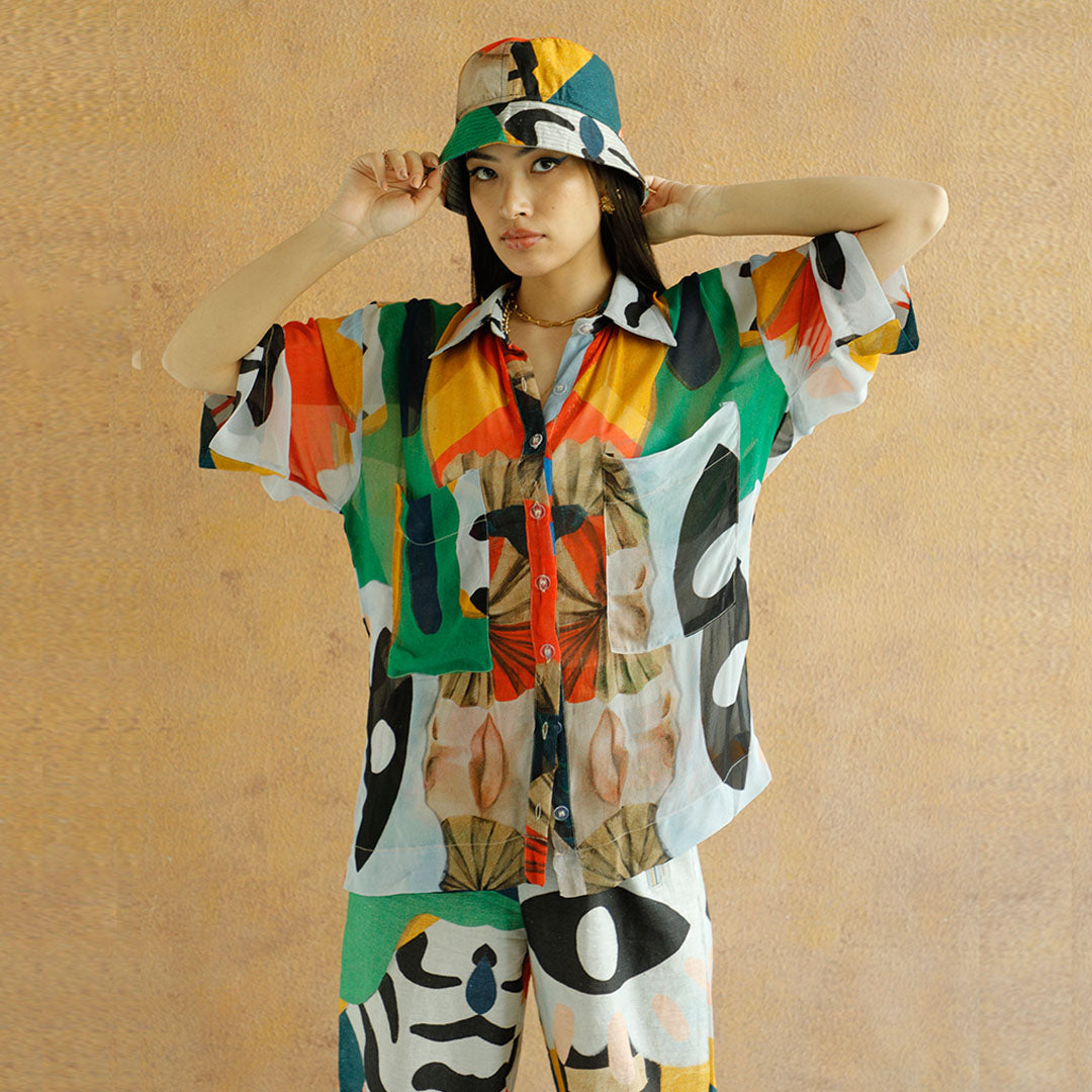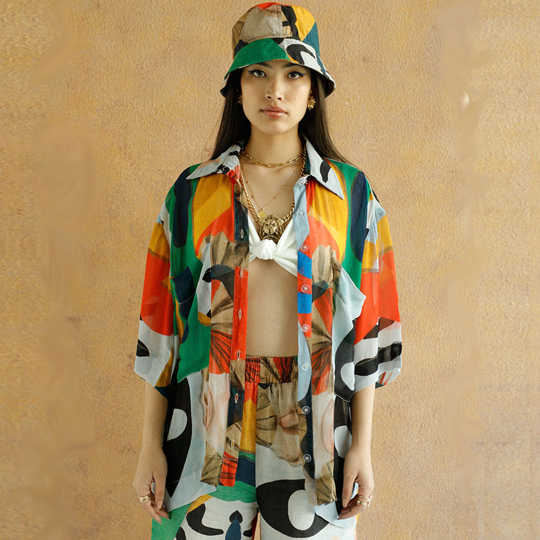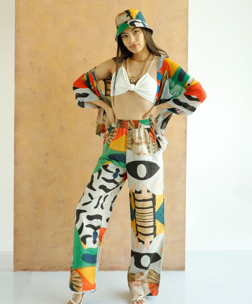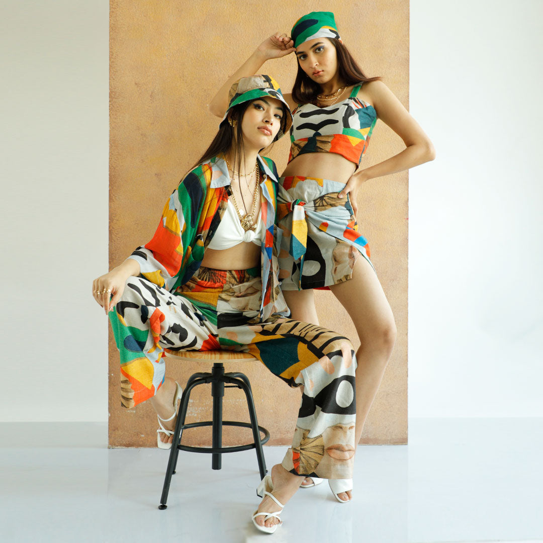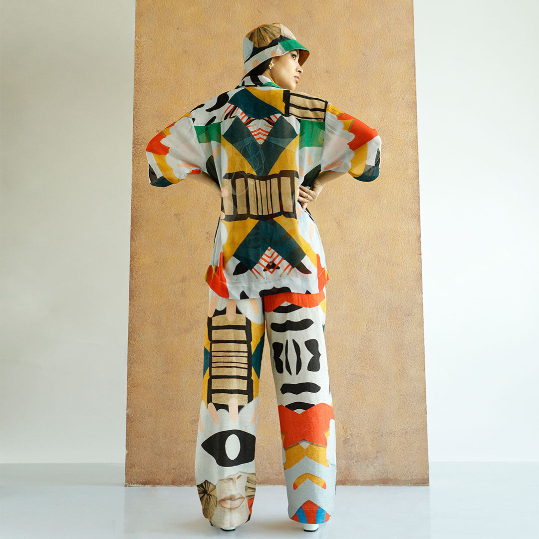 A straight fit pant with a colorful abstract print and a colorful everyday essential printed shirt that is a must have this season.