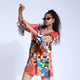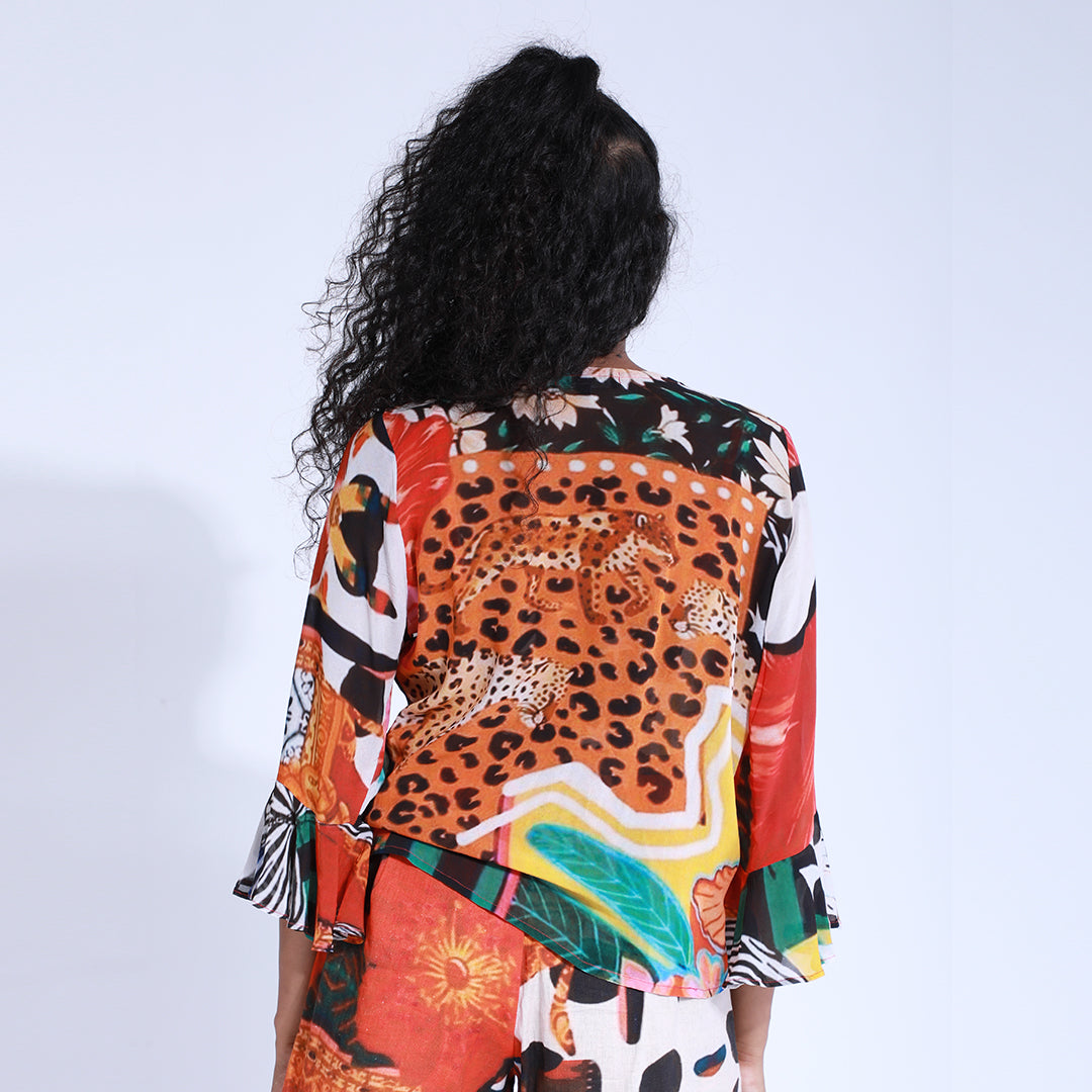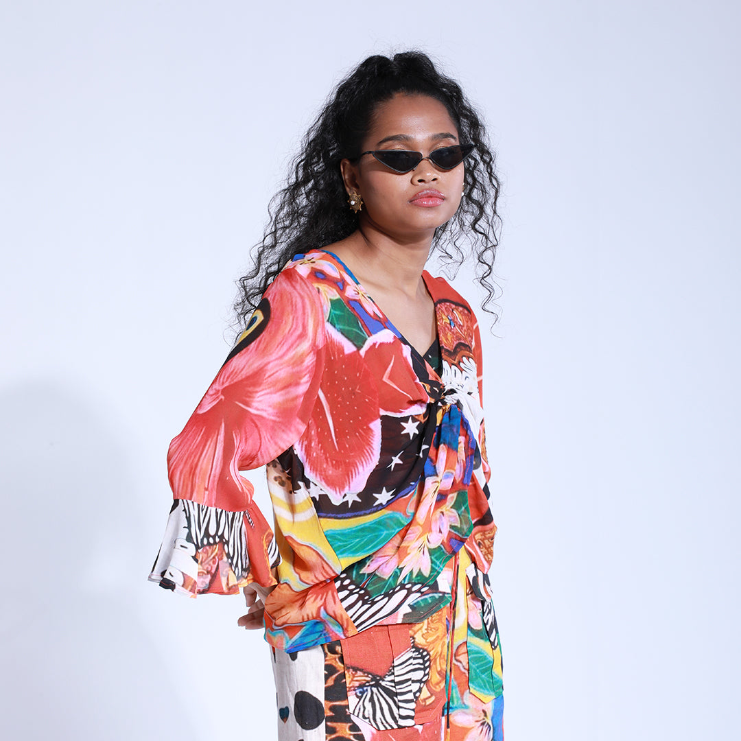 A long sleeve georgette shirt with fluttery sleeves in an all over tropical print, featuring a ruched front and pretty colors. Orange, Georgette. Each print may slightly vary* |