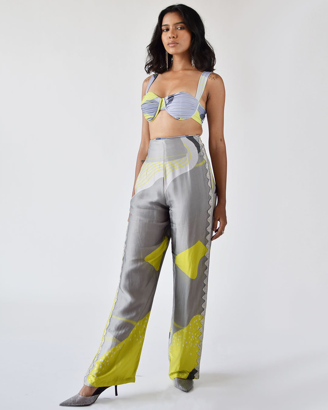 An abstract print pant that makes you feel chic with the embroidery detailing.