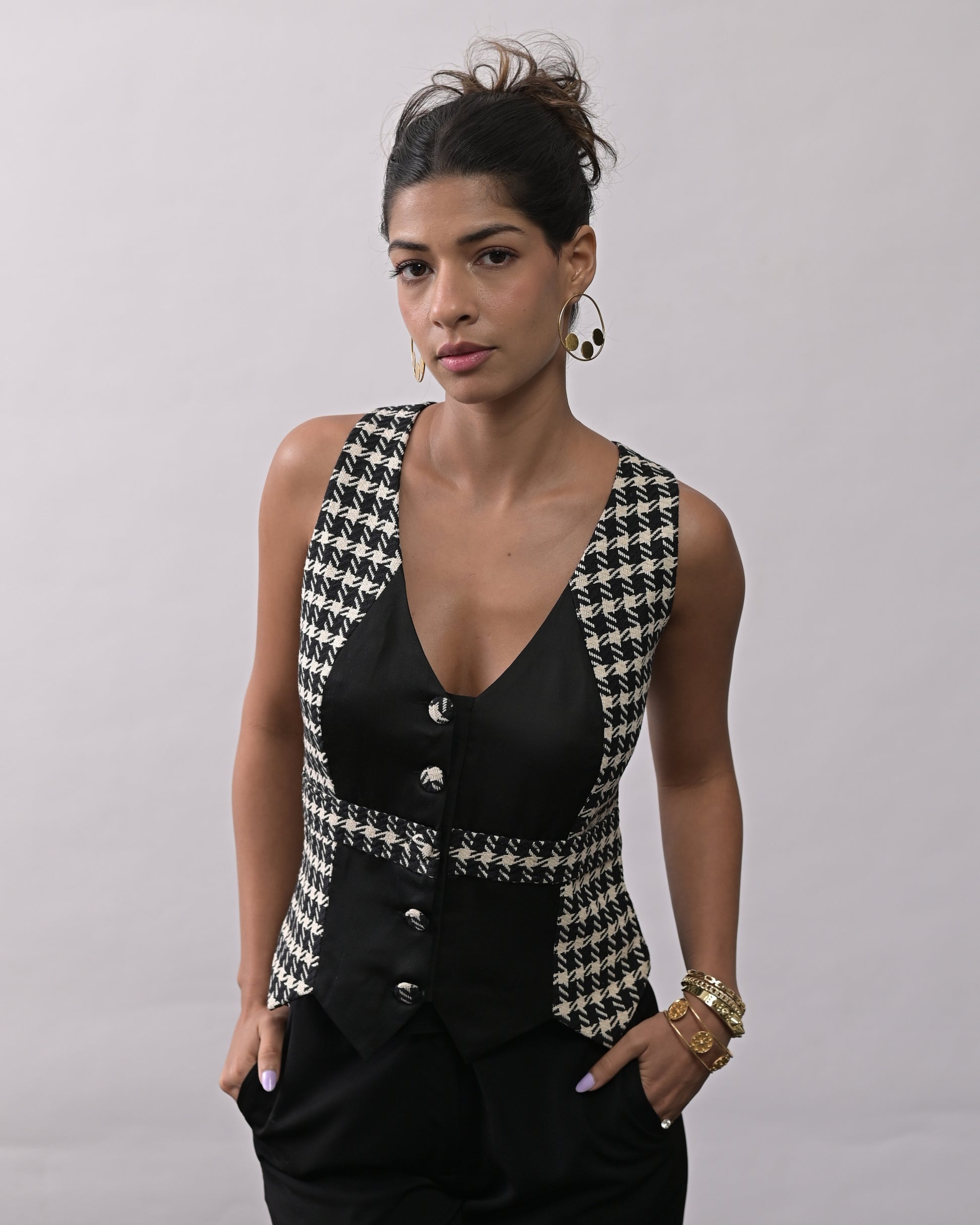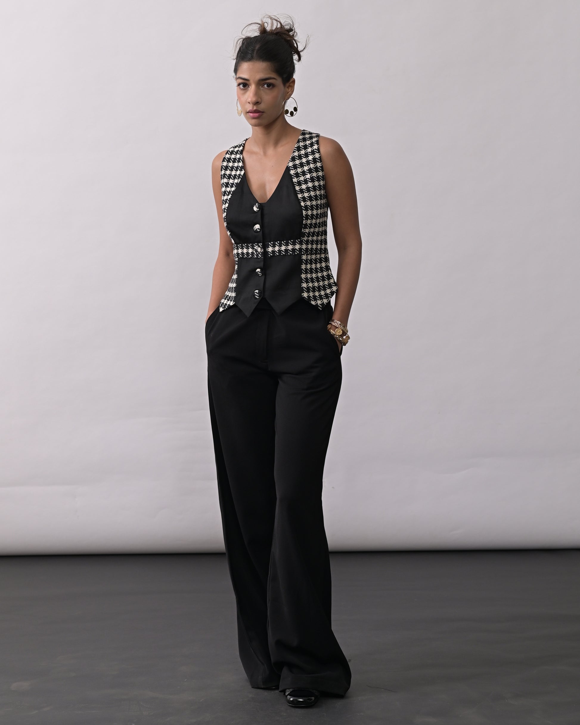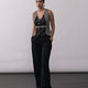 V neck, patterned front, high waist, wide leg.