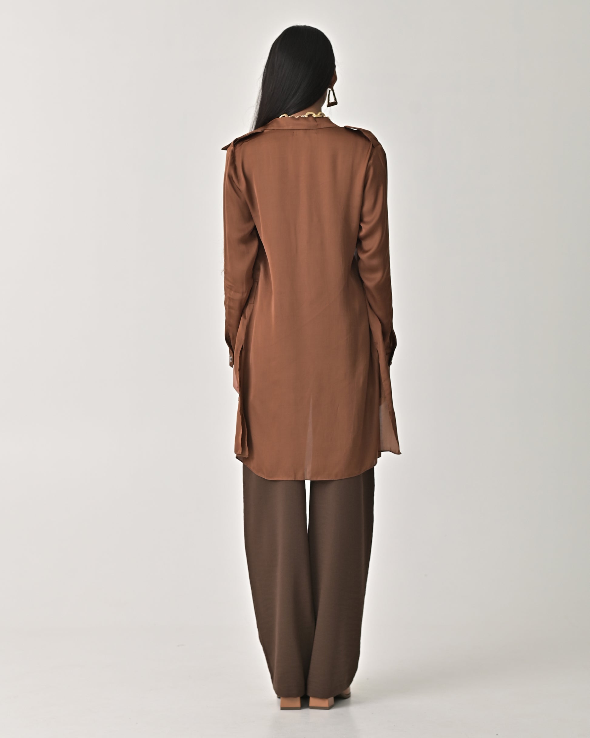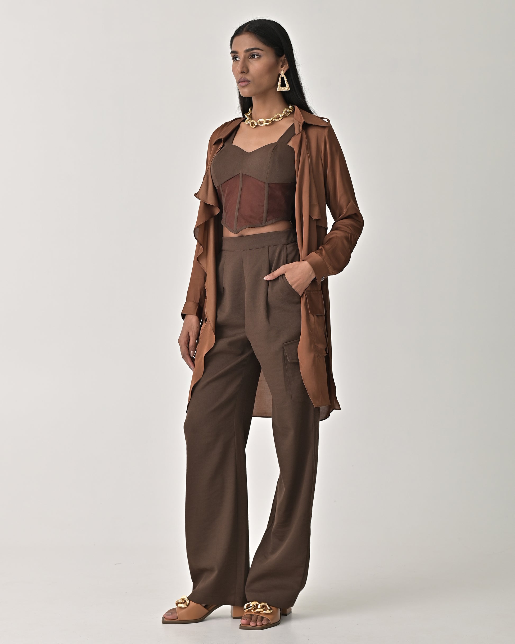 Take your style up a notch with this brown overlay cape.