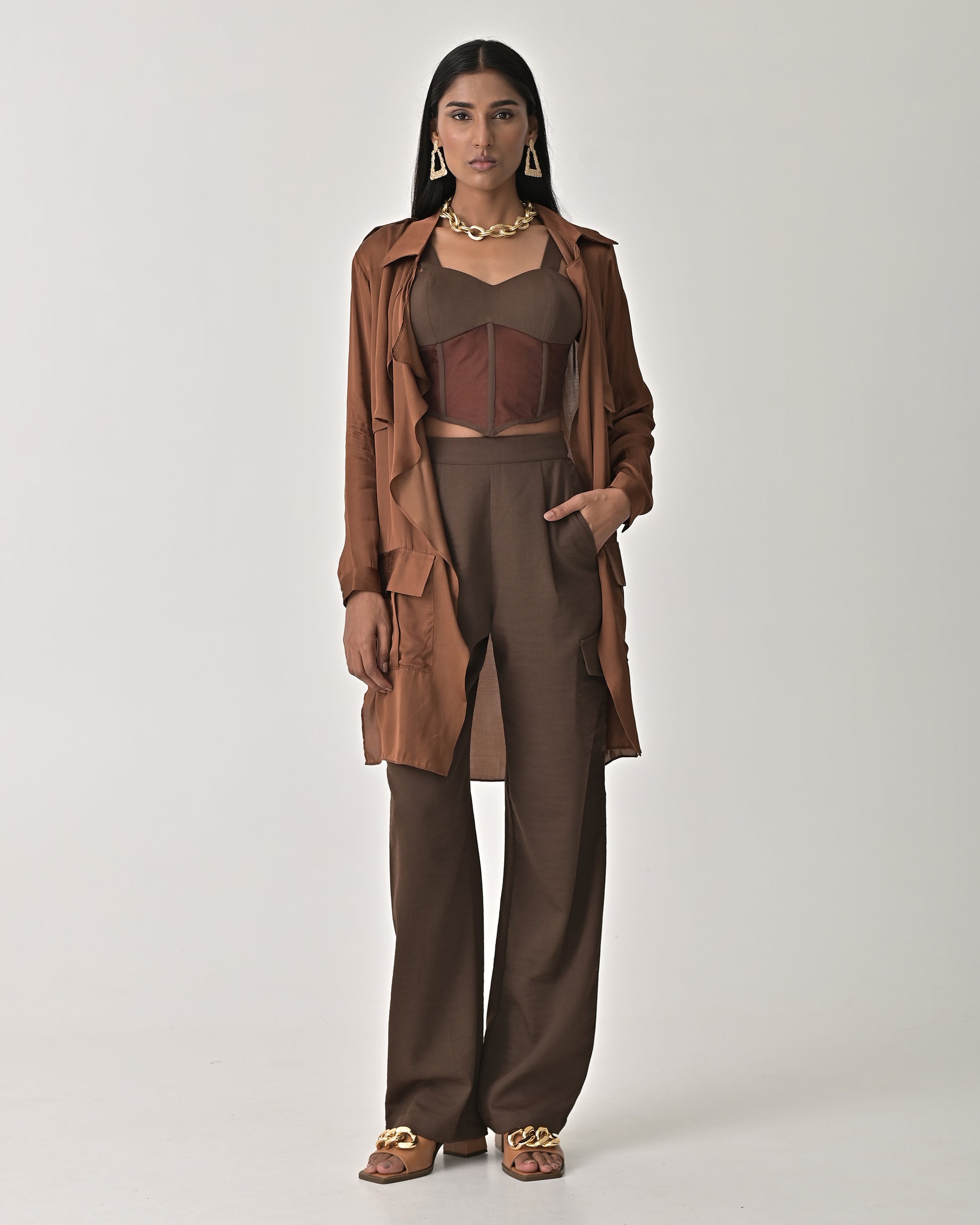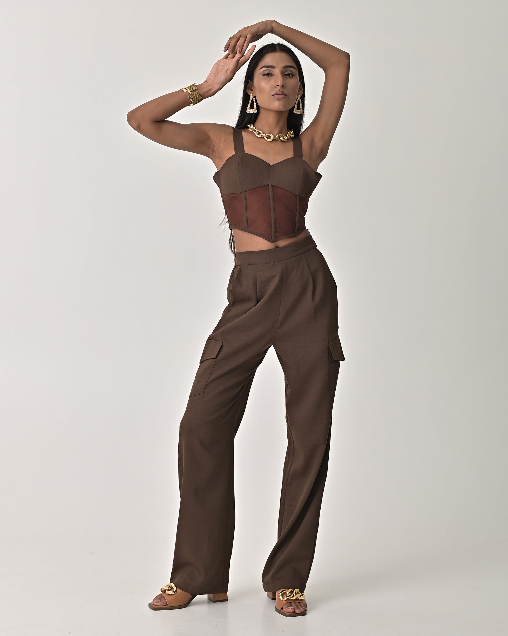 Crafted with details, it is finished with a sleeveless corset design and flowy pants.