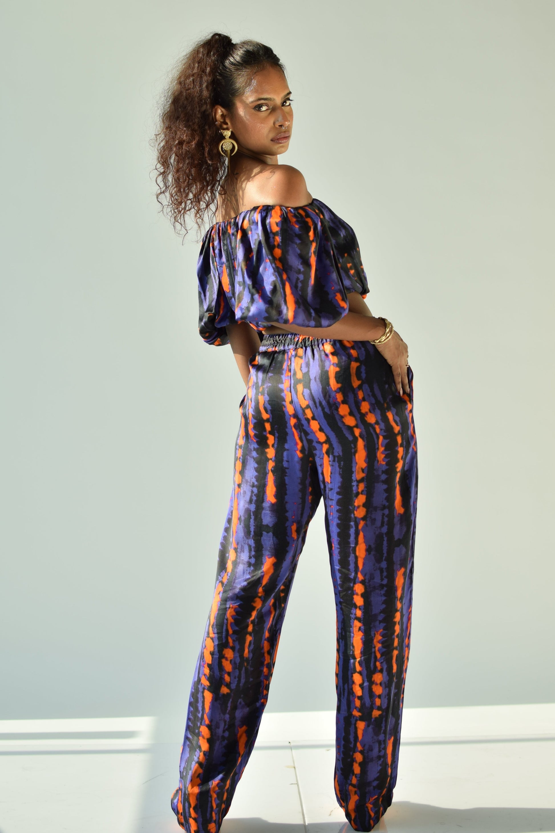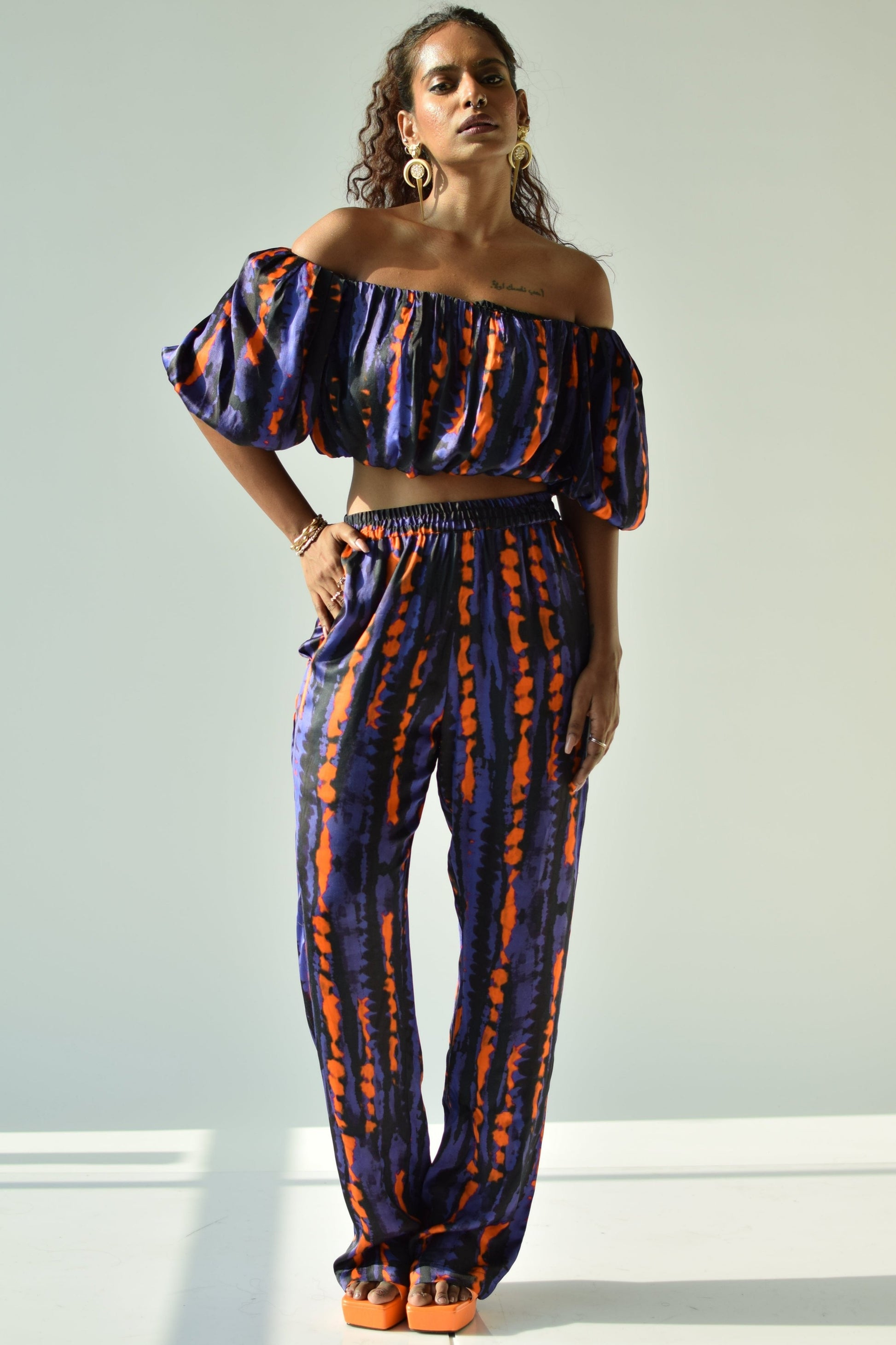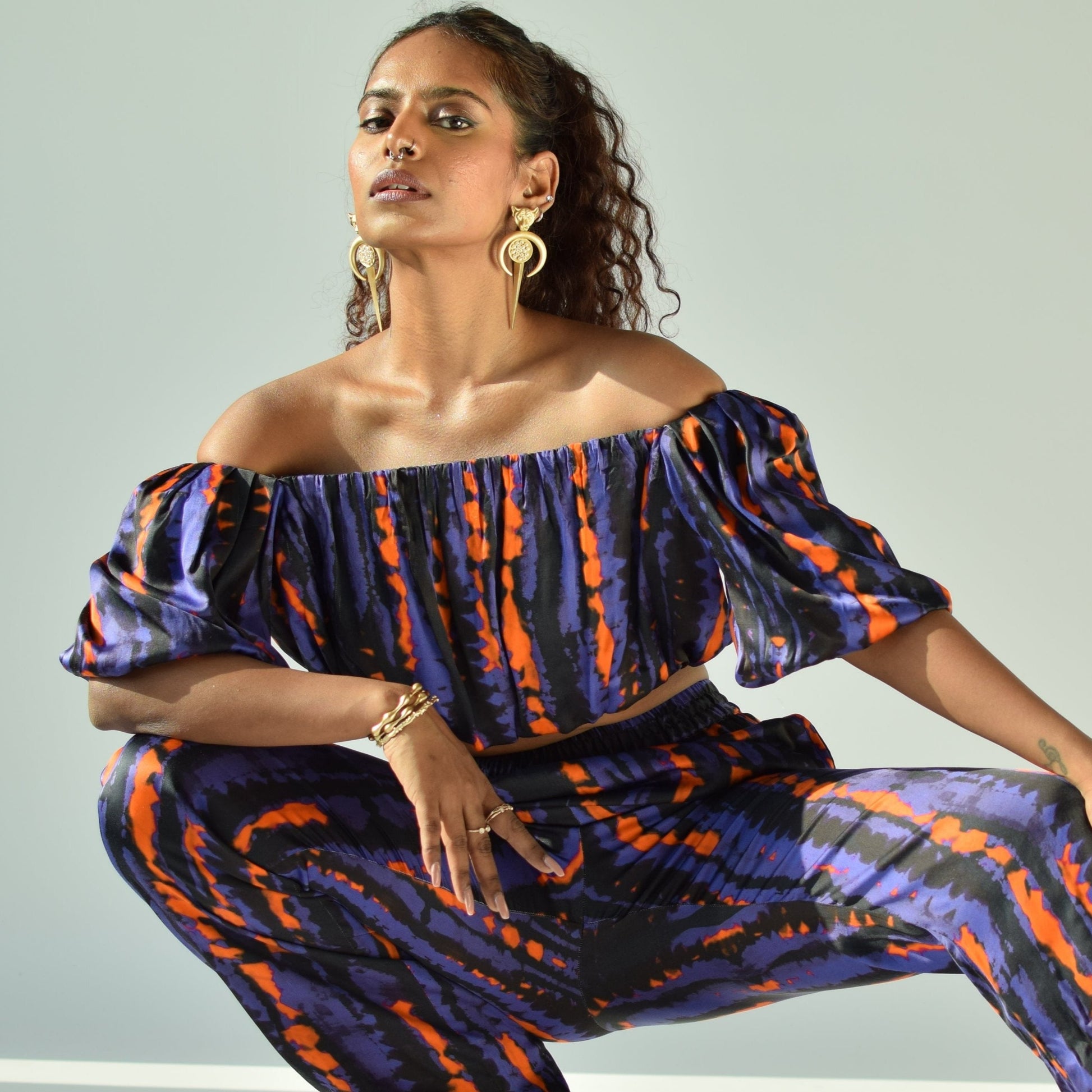An abstract printed straight pant and crop top in satin should be your go-to outfit.