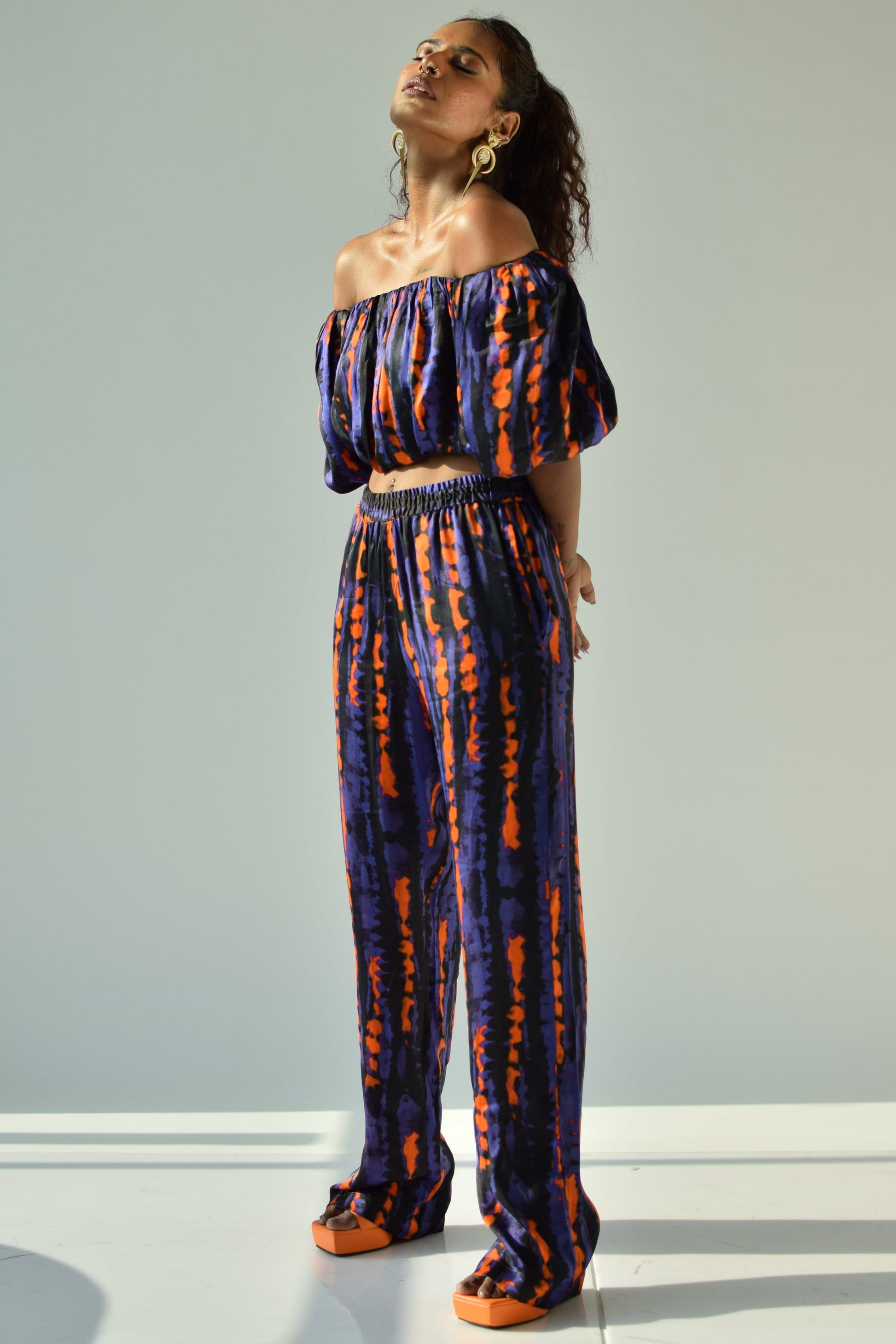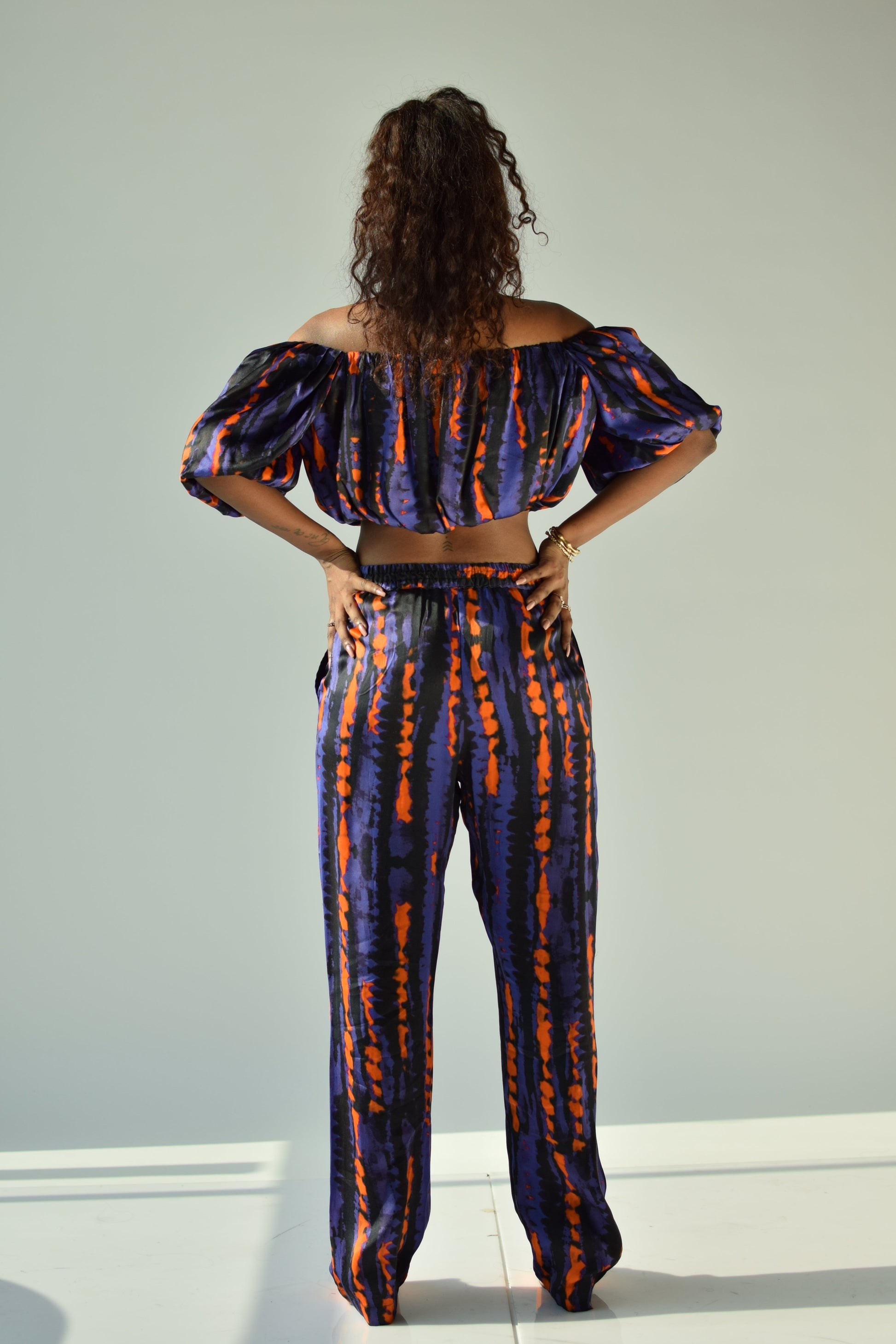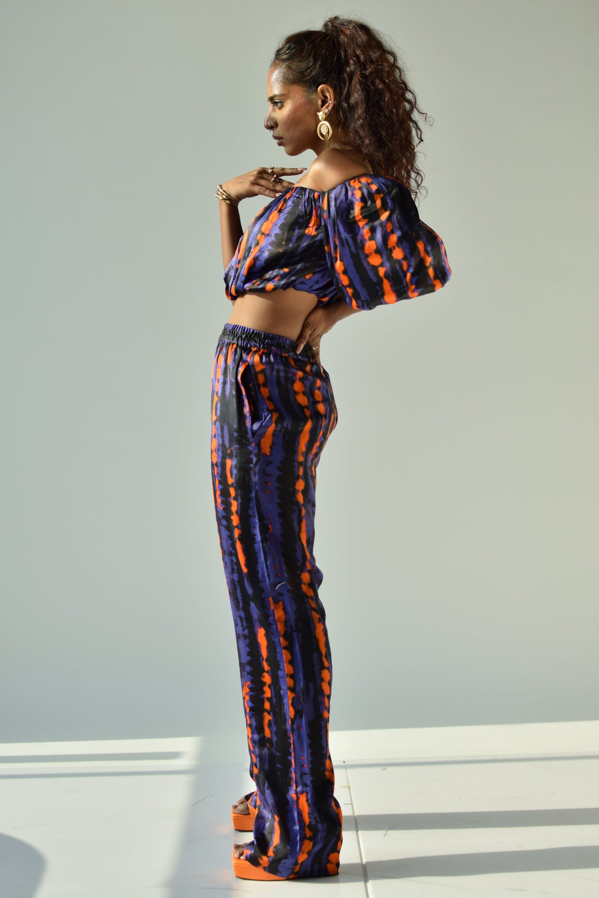 An abstract printed straight pant and crop top in satin should be your go-to outfit.