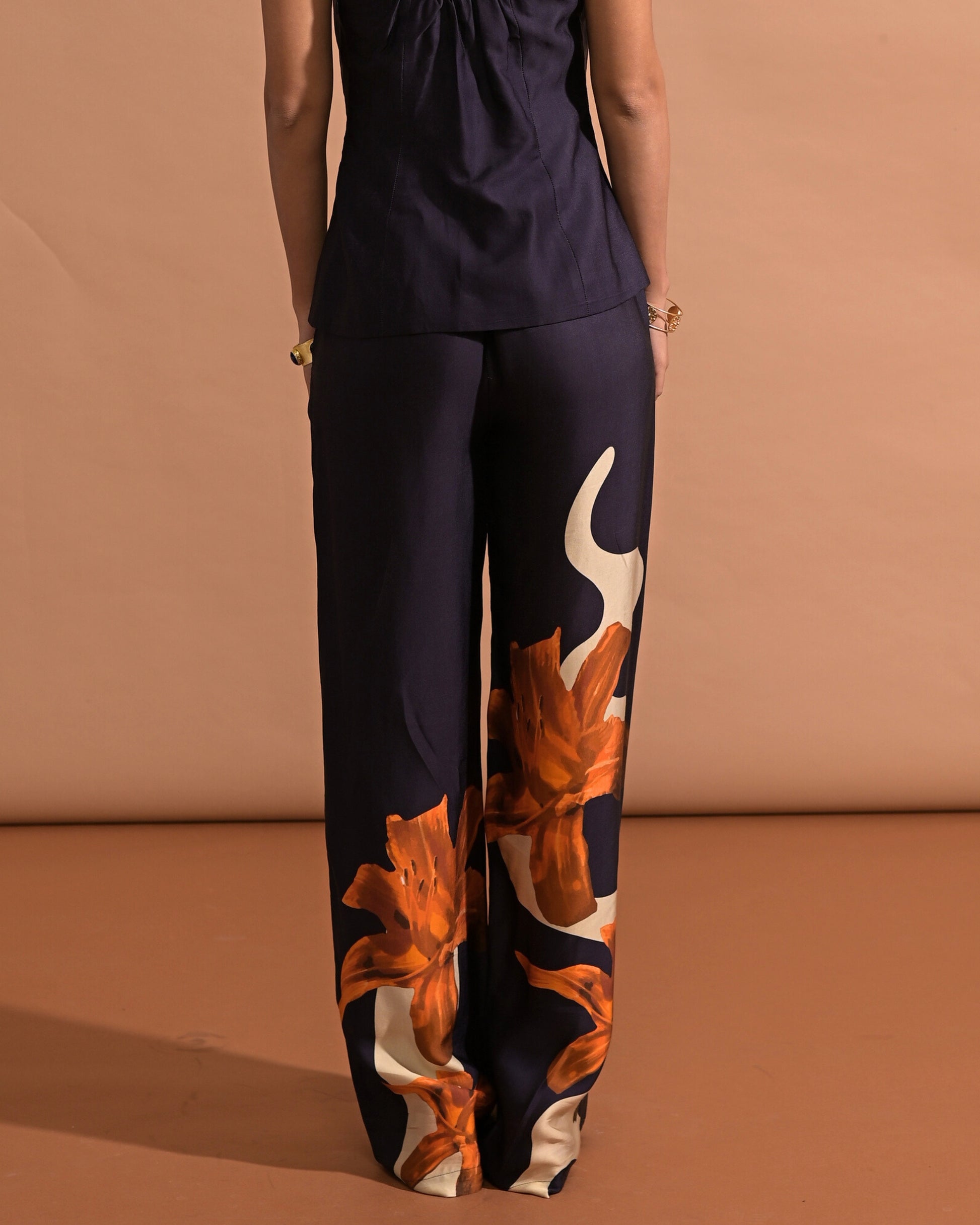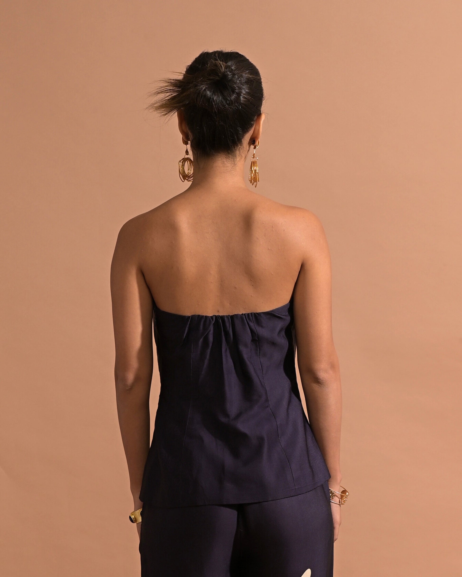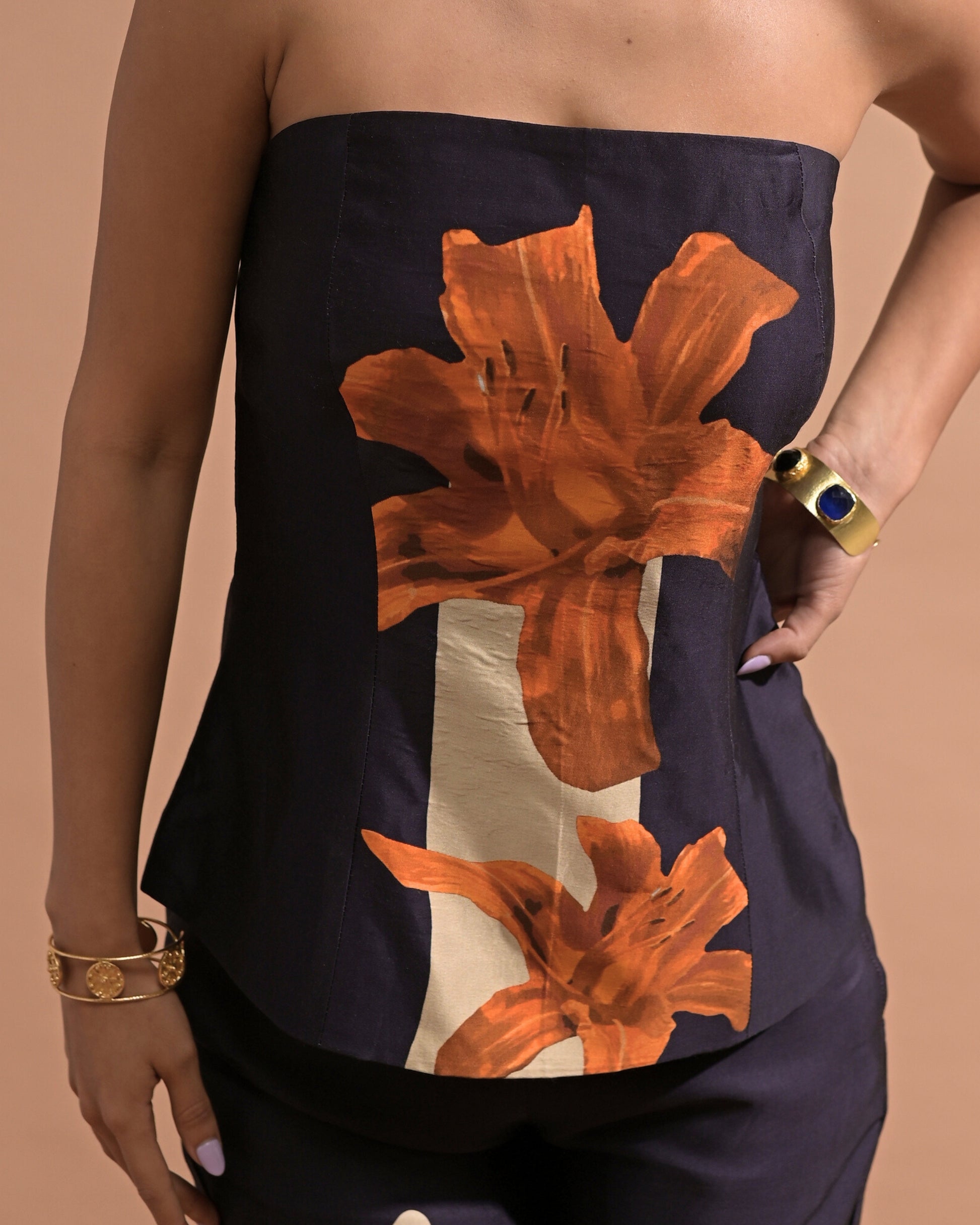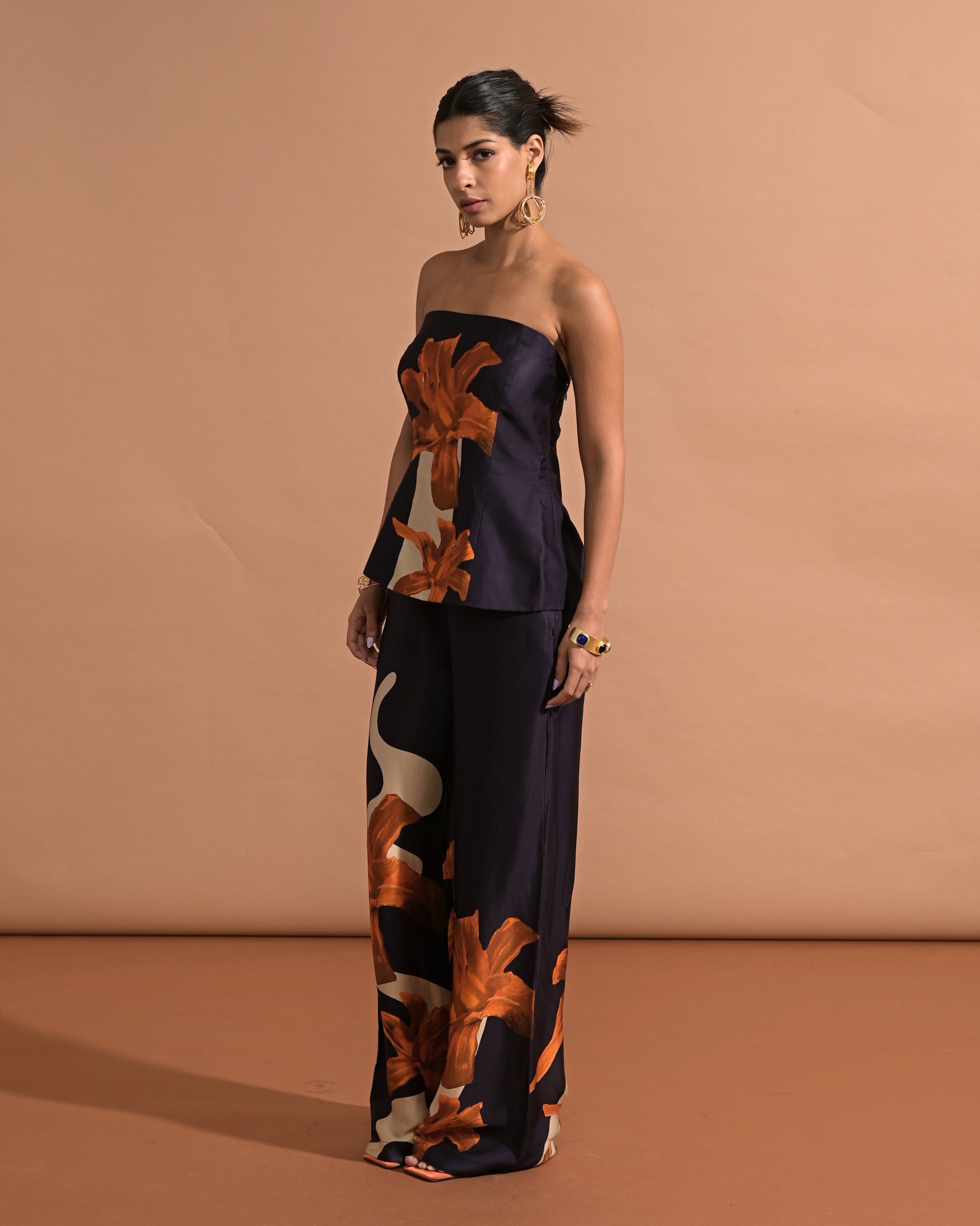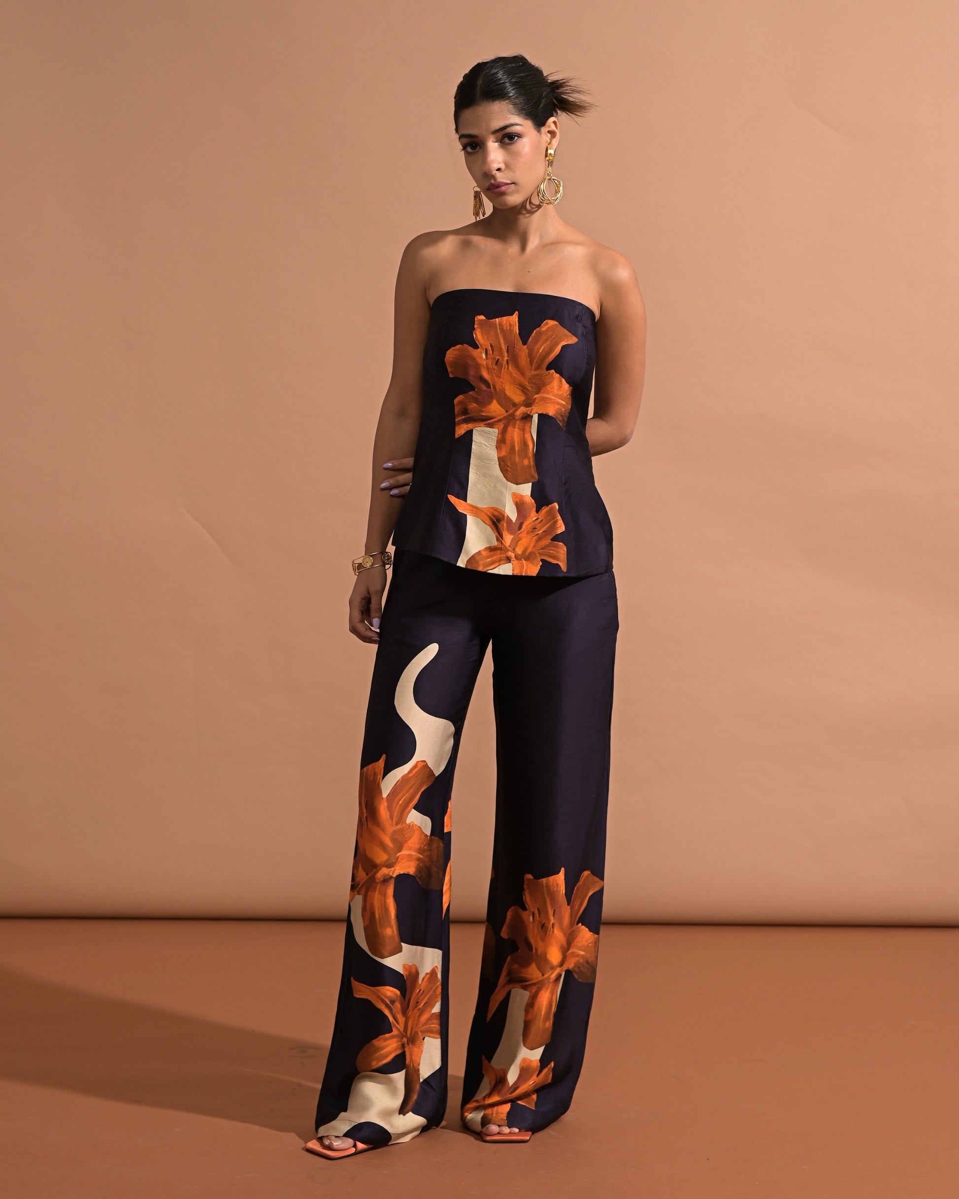 Style - Tube top, straight pants, printed.