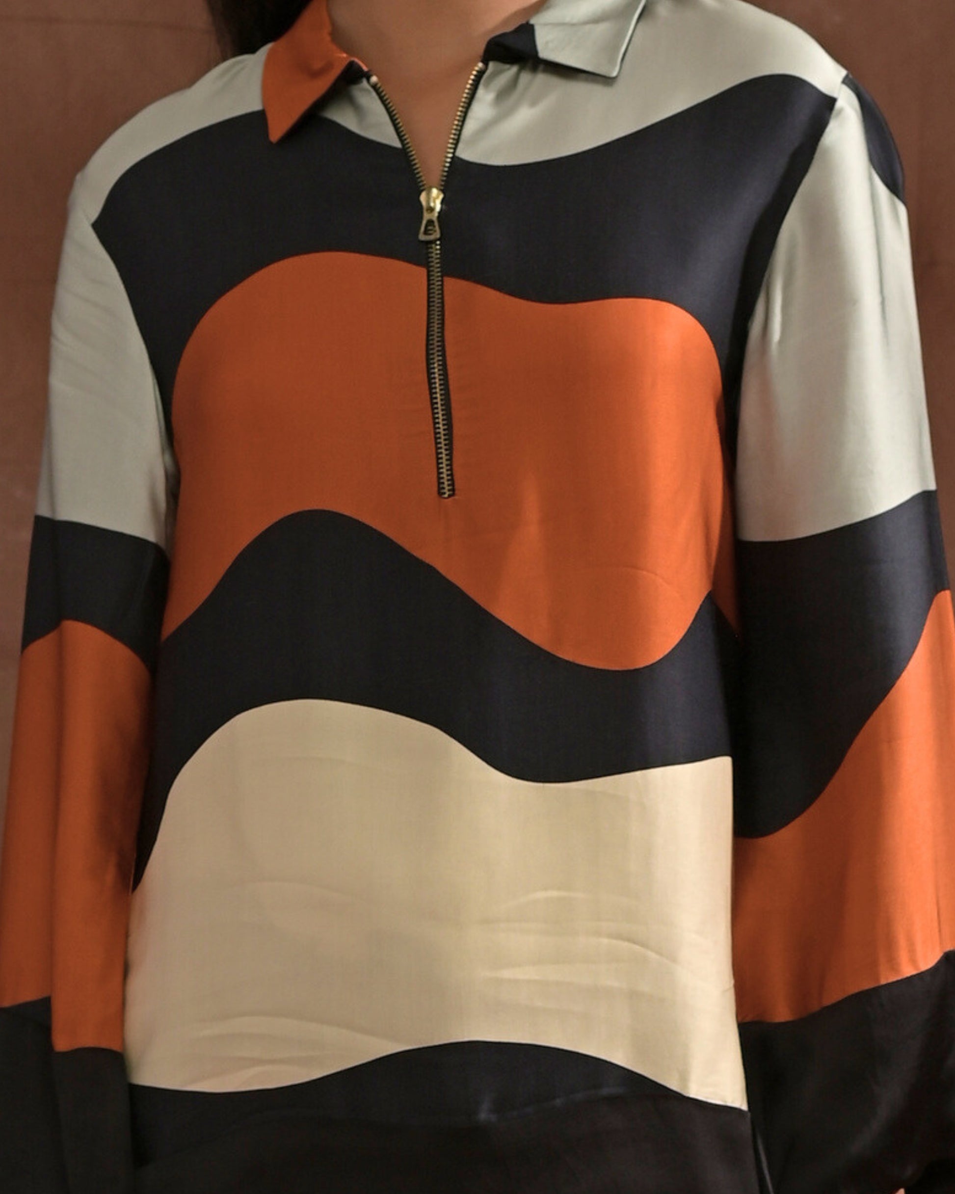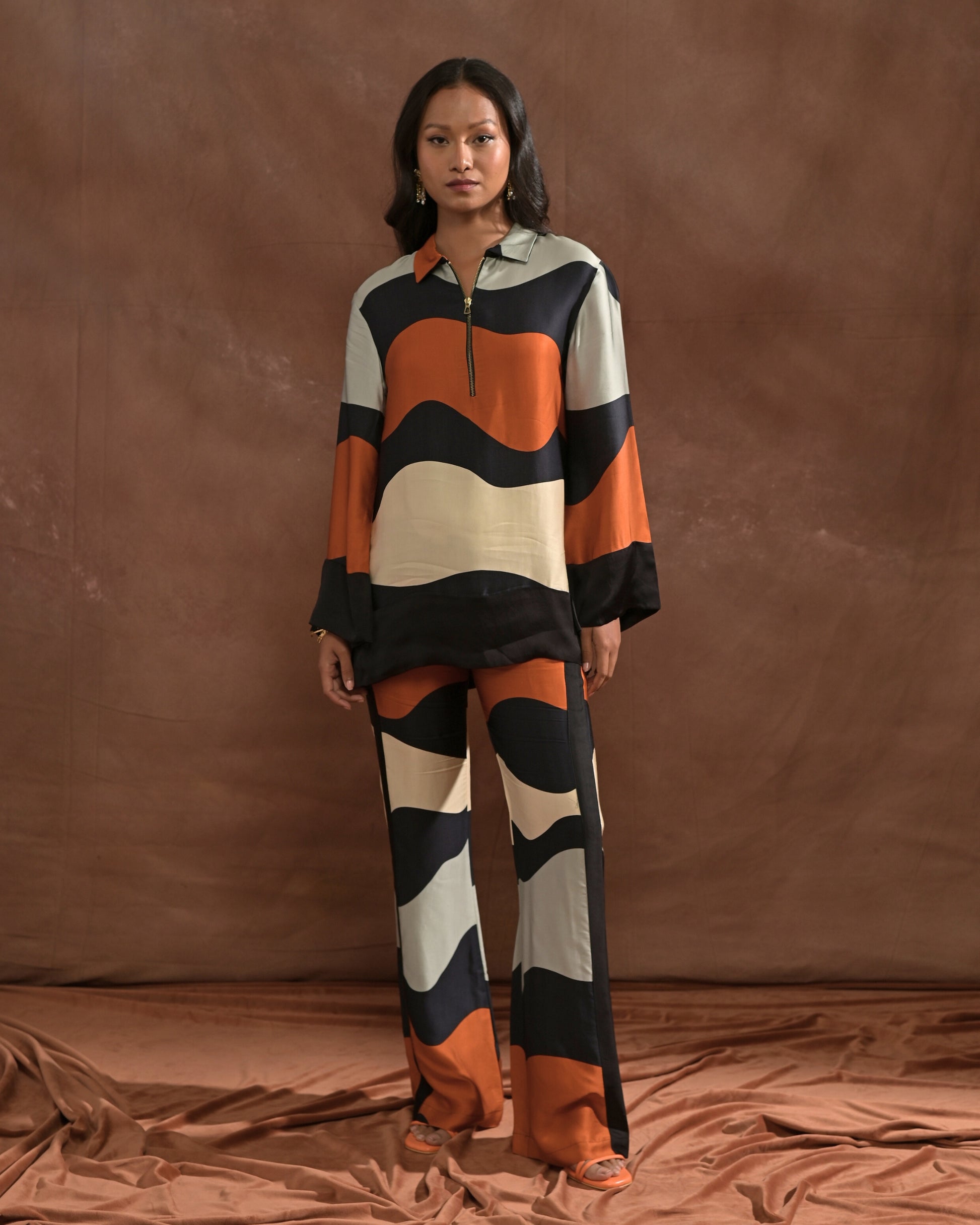 Style - Zipper shirt, straight pants, printed.