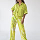 A relaxed fit cropped shirt with delicate abstract print details and solid pants in a refreshing summer color.
