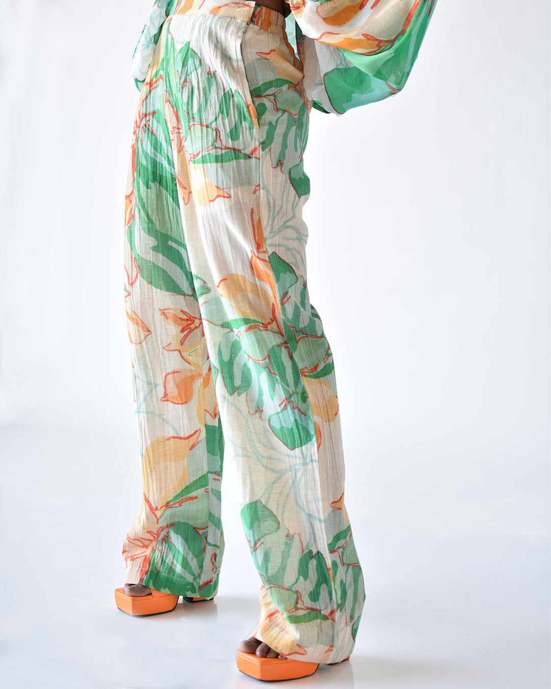 A maximalist floral printed pant in blended fabric that makes you feel light and breezy.