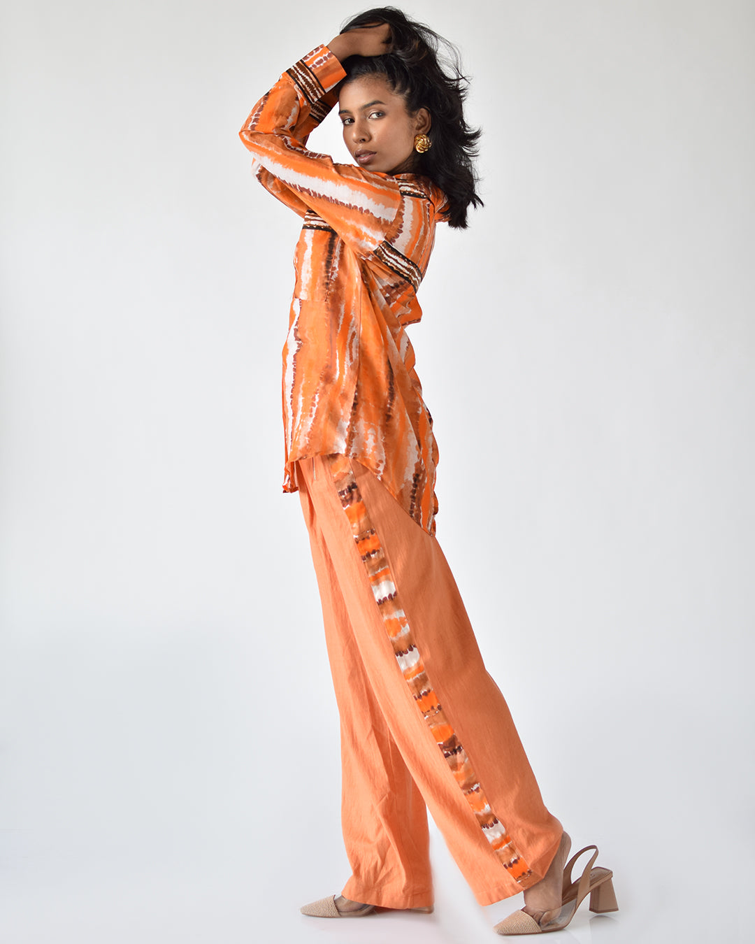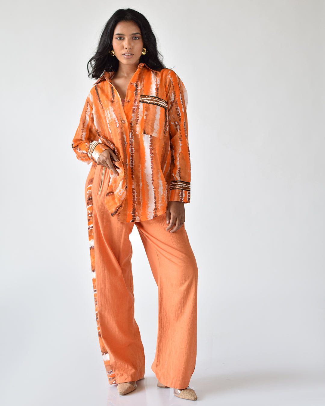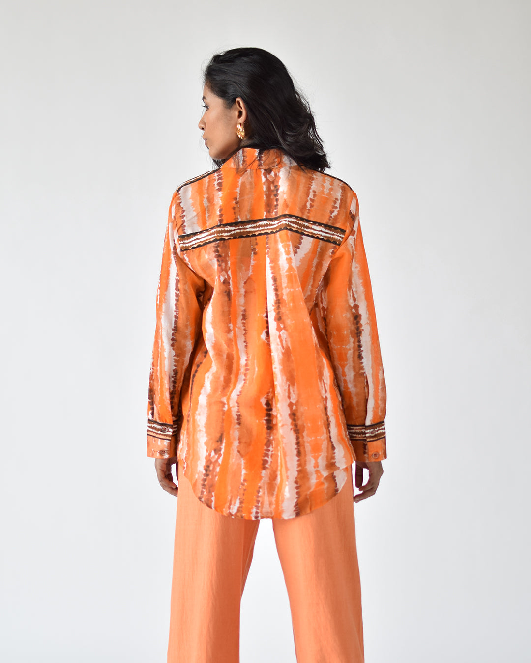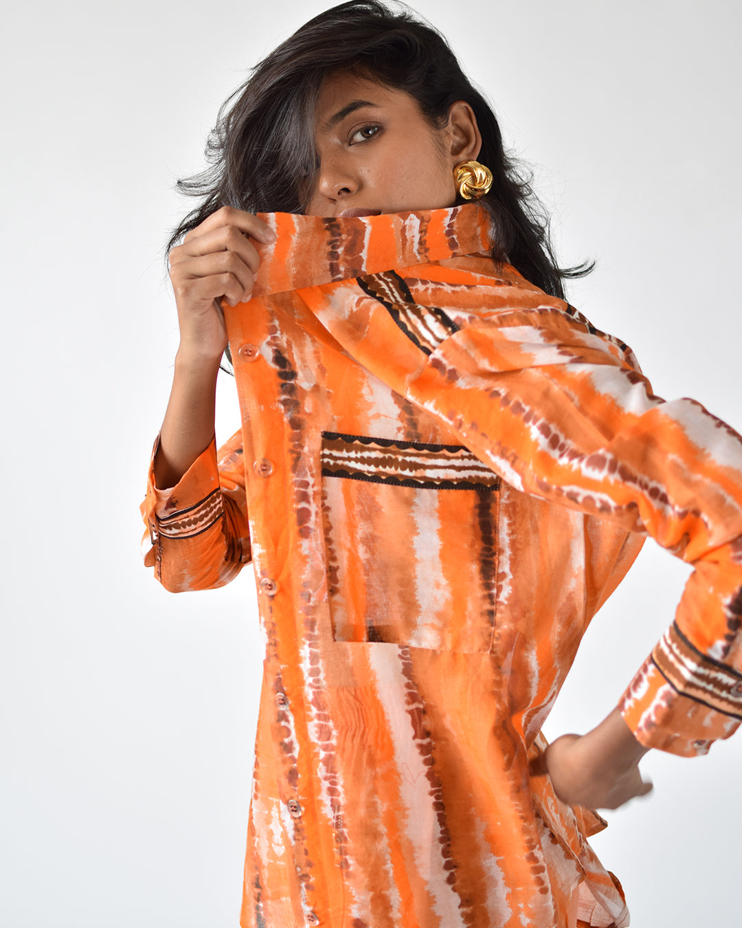 A cool, bright hued shirt with pockets and a beautiful tie-dye print.